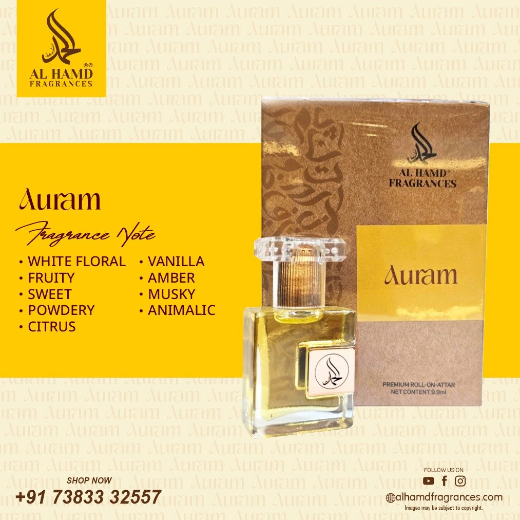 Auram is a radiant floral-fruity attar with a golden heart โ sparkling with citrus, warmed by musk and amber, and wrapped in timeless elegance.